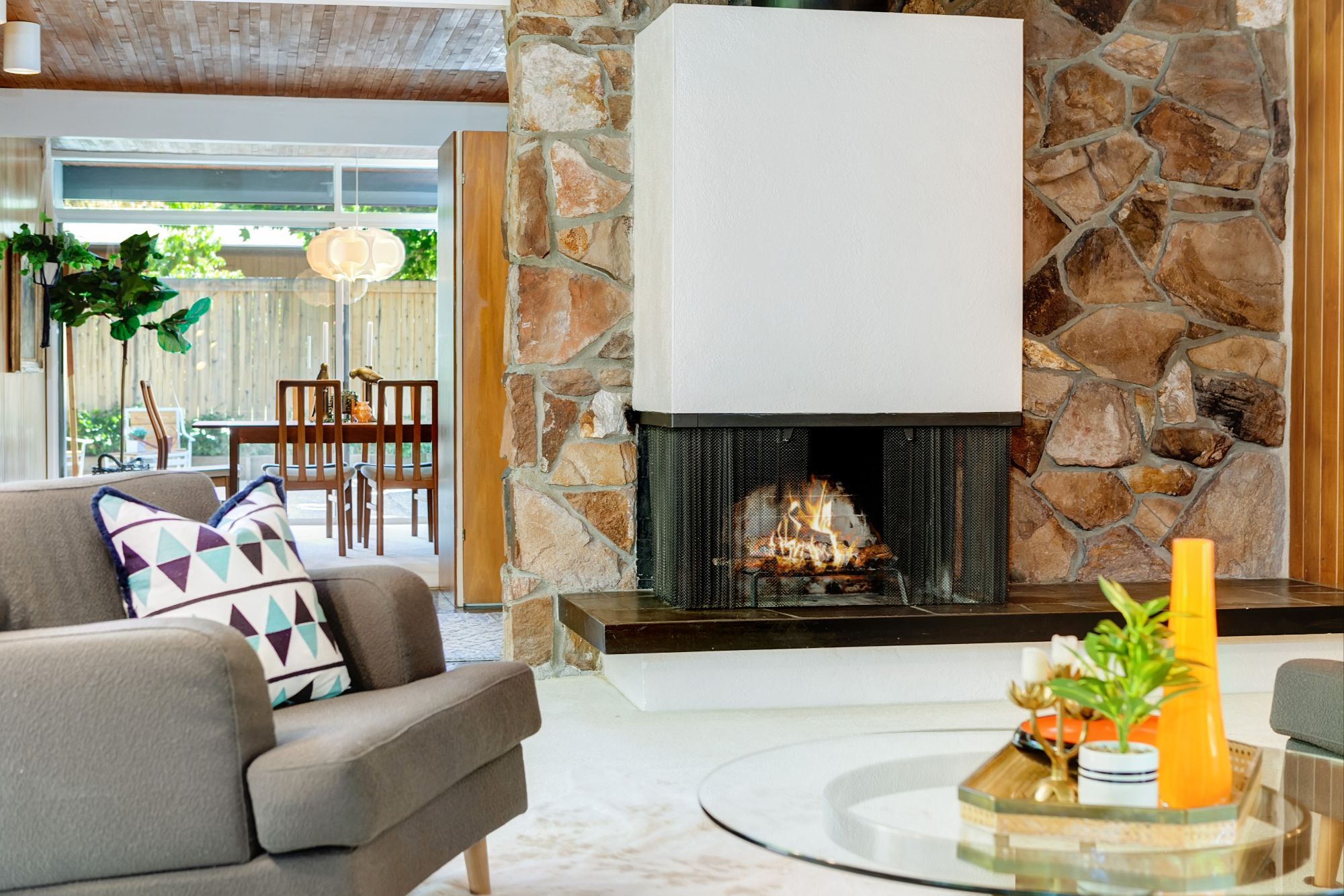 To one side, a spacious living room with a pier-style fireplace wall, true to the era’s spirit. Floor-to-ceiling glass opens the room to a shaded deck and mature gardens, seamlessly dissolving the boundary between indoors and out. Across the entry, the formal dining room mirrors this gesture, with another wall of glass that opens to an additional terrace. Every space orients toward the outdoors—a hallmark of Mid-Century influence.