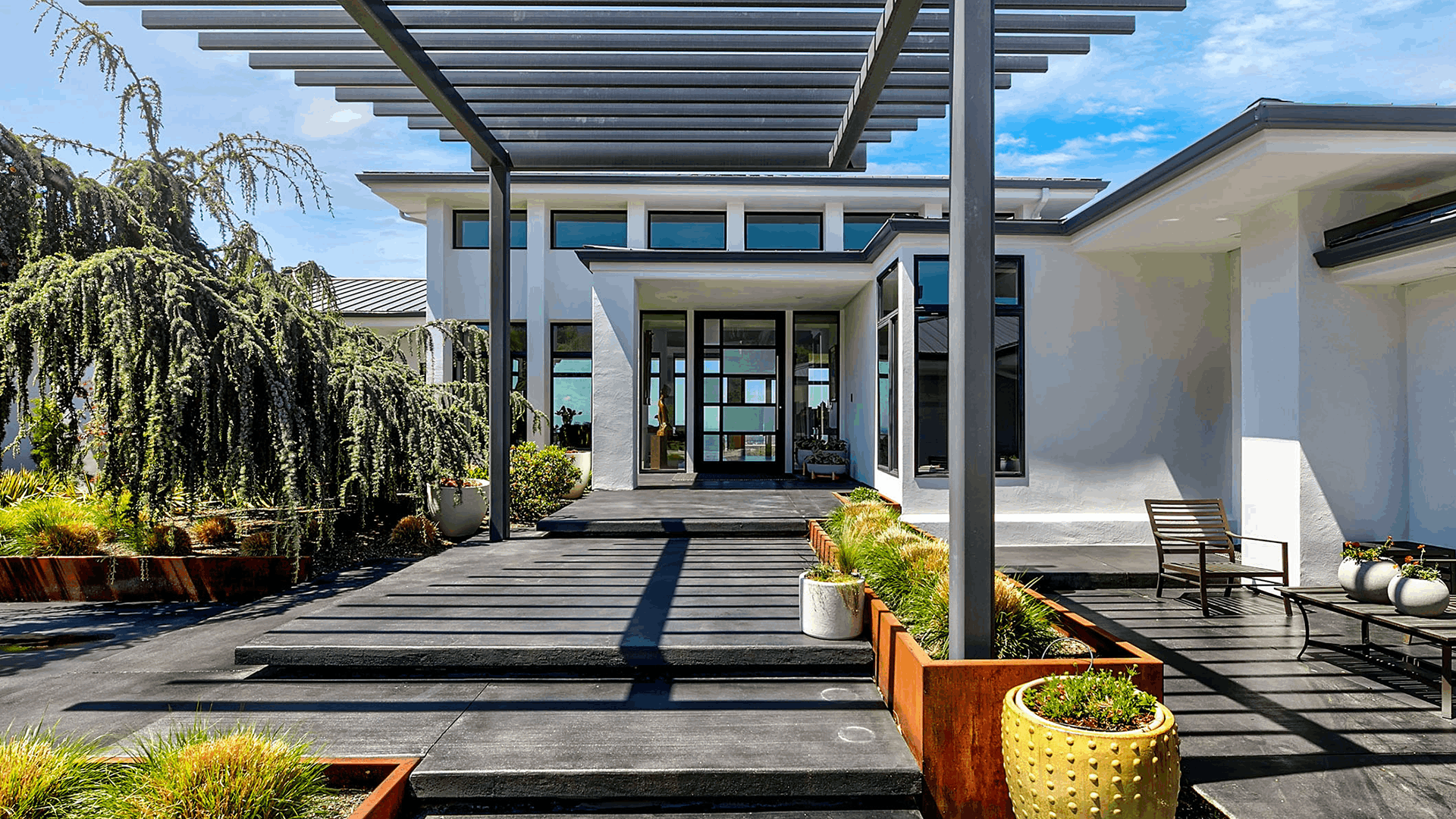 The dramatic front courtyard sets the tone for the rest of the residence, where art and architecture are inseparable. Guests are welcomed into an entry lounge framed by soaring windows that draw the eye outward to breathtaking vistas. The interior aesthetic is one of refined sophistication, with clean lines, generously scaled spaces, and thoughtful custom features—including an elevator that adds ease to the luxury experience.