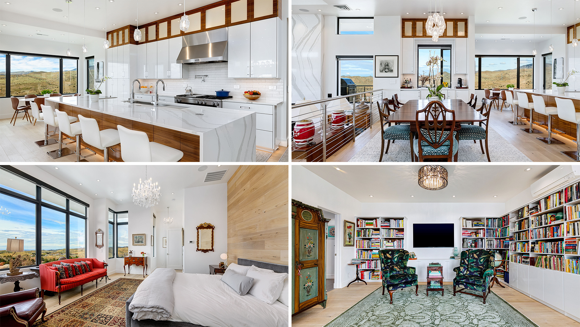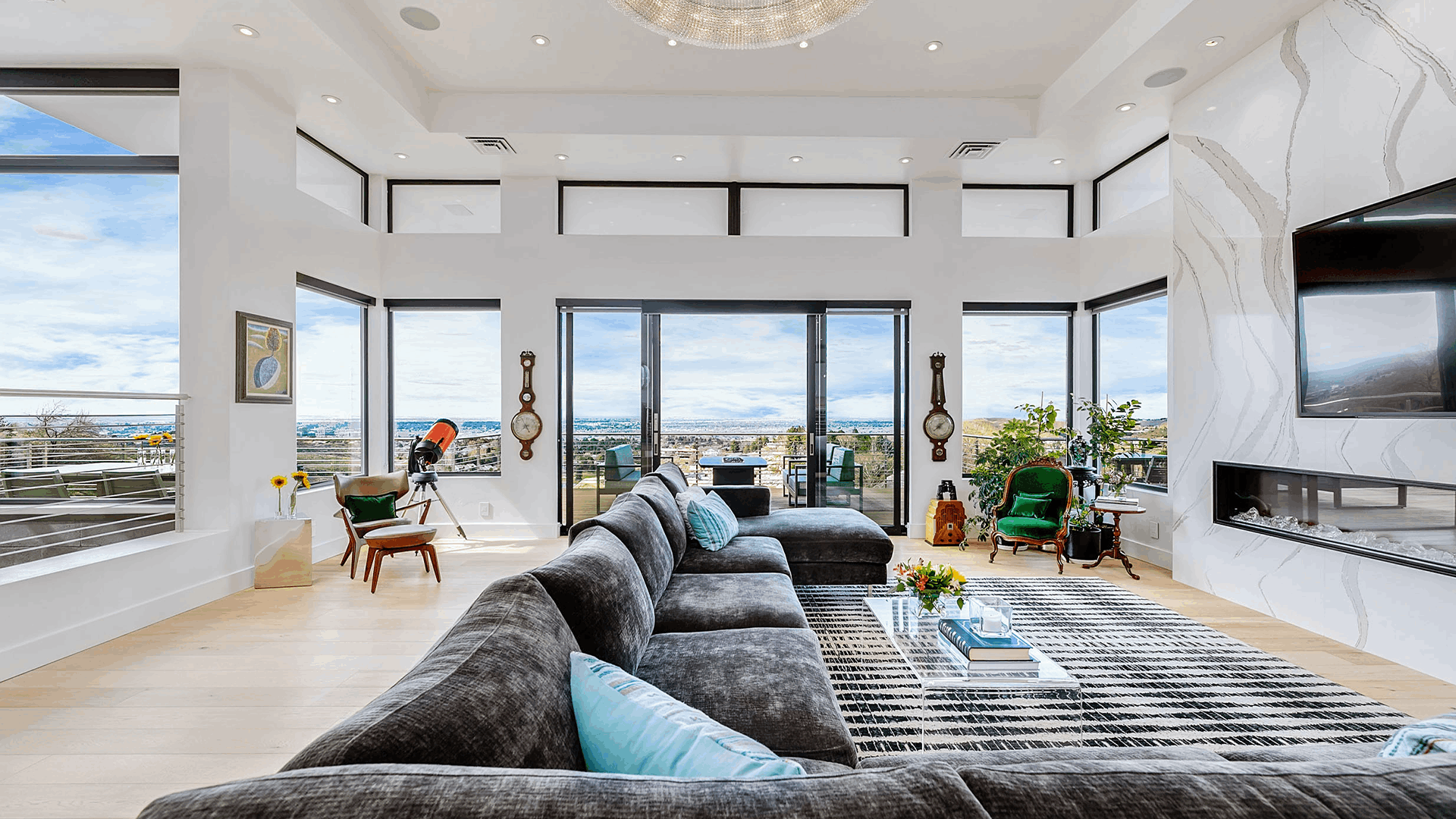 The main-level primary sanctuary offers ever-changing views of sunsets and city lights, while a showstopping kitchen, private library, exercise room, and glass-wrapped living areas embody elevated design. Multiple sets of sliding glass doors extend the living space to expansive decks, inviting the outdoors in and creating a seamless flow for entertaining.